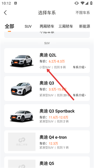 4、進入奧迪車系列表頁后,可查看各車系(如奧迪Q2L)的價格、車型信息,點擊對應(yīng)車系可看更詳細內(nèi)容。