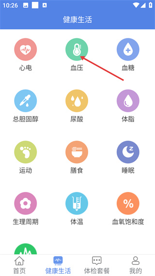 2、在健康生活頁(yè),選擇【血壓】檢測(cè)選項(xiàng),該頁(yè)面含【心電】【血糖】等多類健康檢測(cè)功能入口。