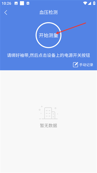 3、進(jìn)入血壓檢測(cè)頁(yè),點(diǎn)擊【開始測(cè)量】按鈕,需先綁好袖帶,頁(yè)面還支持【手動(dòng)記錄】血壓數(shù)據(jù)。