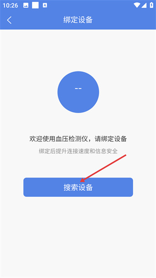4、在綁定設(shè)備頁(yè),點(diǎn)擊【搜索設(shè)備】按鈕,完成血壓檢測(cè)儀的綁定,可提升設(shè)備連接速度與信息安全。