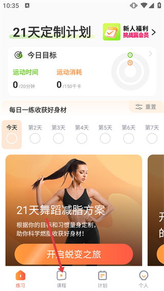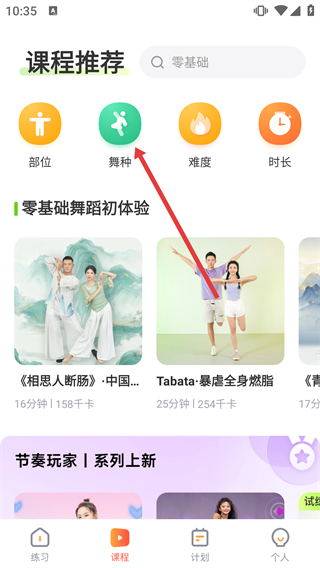 1、在“練習(xí)”頁面底部點擊【課程】按鈕,進(jìn)入課程推薦頁面,可瀏覽不同類型的舞蹈課程。