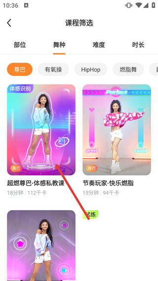 3、在舞種篩選結(jié)果中,選擇目標(biāo)課程,點擊進(jìn)入該課程的詳情頁面。