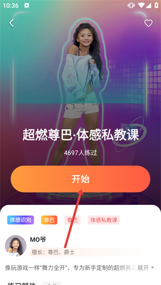 4、在課程詳情頁點擊【開始】按鈕,即可進(jìn)入課程的學(xué)習(xí)/練習(xí)流程,體驗對應(yīng)舞蹈課程內(nèi)容。