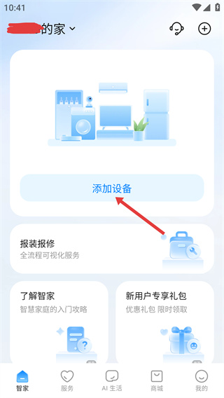 1、在智家頁點擊【添加設備】按鈕,進入設備添加的操作流程。
