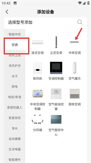2、進入添加設備頁,選擇【空調】分類,可看到【掛式空調】【立式空調】等設備類型,進入對應型號選擇頁。