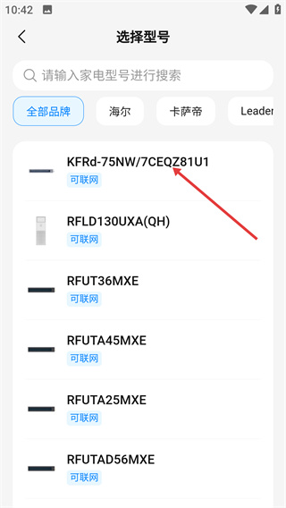 3、在選擇型號頁,選定【KFRd-75NW/7CEQZ81U1】型號,完成設備型號的選擇步驟。