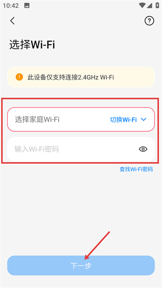 4、進入選擇WiFi頁,注意設備僅支持【2.4GHz-Wi-Fi】,選擇家庭WiFi并輸入密碼,點擊【下一步】繼續(xù)配置。