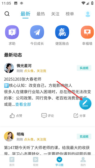 1、在學(xué)習(xí)圈頁(yè)面,點(diǎn)擊右下角編輯按鈕,進(jìn)入內(nèi)容發(fā)布頁(yè)。