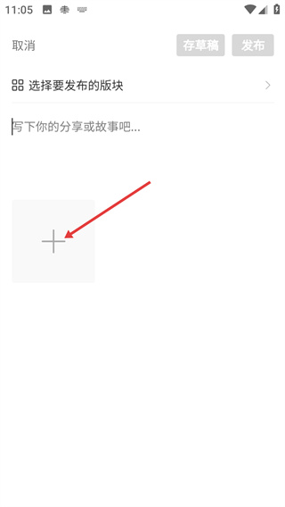 2、進(jìn)入內(nèi)容發(fā)布頁(yè),點(diǎn)擊輸入框下方的加號(hào)按鈕,彈出圖片選擇的操作選項(xiàng),可添加素材。