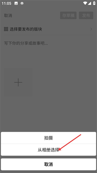 3、在彈出的選項(xiàng)中選擇【從相冊(cè)選擇】,進(jìn)入圖片選擇頁(yè)面,可選取相冊(cè)內(nèi)的素材用于發(fā)布內(nèi)容。