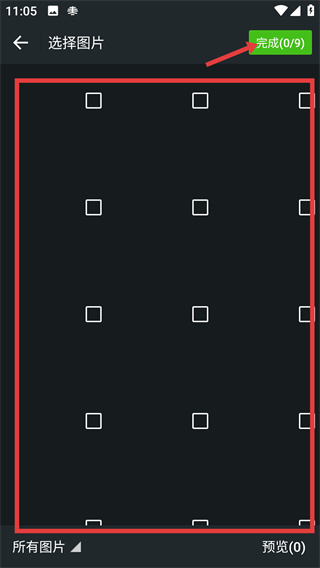 4、在選擇圖片頁(yè),勾選所需圖片后,點(diǎn)擊右上角【完成】按鈕,完成圖片素材的添加步驟。