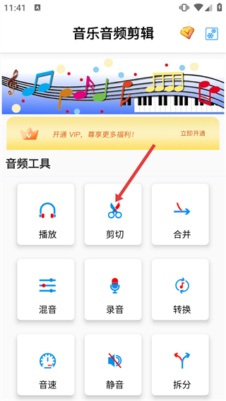 1、在【音樂音頻剪輯】界面,找到【音頻工具】中的【剪切】按鈕,點(diǎn)擊它進(jìn)入音頻選擇的操作環(huán)節(jié)。