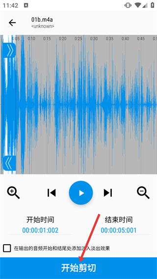 3、在音頻波形編輯界面,設(shè)置好【開始時(shí)間】與【結(jié)束時(shí)間】,確認(rèn)后點(diǎn)擊【開始剪切】執(zhí)行剪輯操作。