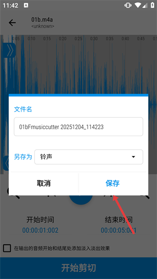 4、剪輯完成后,在彈出窗口確認(rèn)【文件名】及【另存為-鈴聲】的類型,點(diǎn)擊【保存】完成音頻的導(dǎo)出。