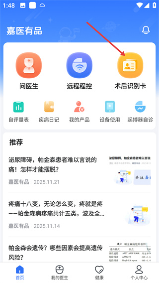 1、在【嘉醫(yī)有品】首頁點擊【術(shù)后識別卡】選項,進(jìn)入術(shù)后識別卡功能頁。