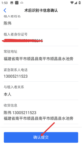 4、進(jìn)入【術(shù)后識別卡信息確認(rèn)】頁,核對植入者信息、緊急聯(lián)系人等內(nèi)容后,點擊【確認(rèn)提交】完成申請流程。