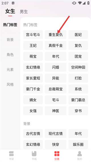 1、在分類界面的女生標(biāo)簽下,點(diǎn)擊【重生復(fù)仇】標(biāo)簽,進(jìn)入該題材的作品列表頁面,可瀏覽該類別下的作品內(nèi)容。