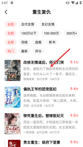 2、進(jìn)入【重生復(fù)仇】題材的作品列表后,點(diǎn)擊目標(biāo)作品條目,進(jìn)入該作品的閱讀界面,開始閱讀對應(yīng)內(nèi)容。