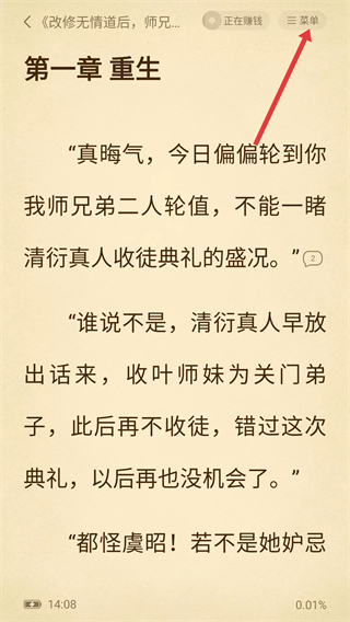 3、在作品閱讀界面,點(diǎn)擊右上角的【菜單】按鈕,可展開閱讀相關(guān)的功能選項(xiàng),便于調(diào)整閱讀相關(guān)設(shè)置。