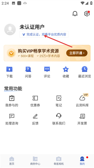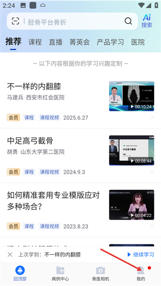 1、在醫(yī)療學(xué)習(xí)平臺(tái)推薦頁,點(diǎn)擊底部【我的】選項(xiàng),進(jìn)入個(gè)人中心頁。