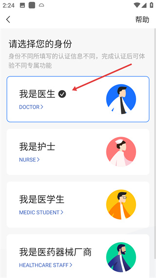 3、在身份選擇頁選定【我是醫(yī)生】選項(xiàng),進(jìn)入該身份對(duì)應(yīng)的基本信息填寫頁面,準(zhǔn)備完善認(rèn)證資料。