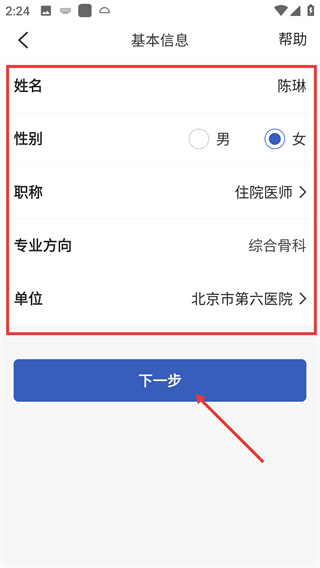 4、在基本信息頁完善姓名、性別、職稱等信息后,點(diǎn)擊【下一步】按鈕,繼續(xù)推進(jìn)用戶認(rèn)證流程。