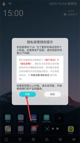 1、閱讀【用戶協(xié)議】-和-【隱私政策】的條款后,點(diǎn)擊【同意】按鈕,即可進(jìn)入布丁UI的功能操作界面。