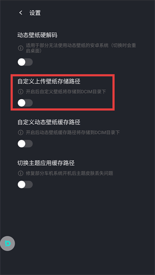 4、在設(shè)置界面,找到【自定義上傳壁紙存儲(chǔ)路徑】選項(xiàng),開啟后自定義壁紙將存儲(chǔ)到DCIM目錄下,按需開啟該功能。