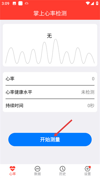 1、在【掌上心率檢測(cè)】主界面點(diǎn)擊【開始測(cè)量】按鈕,進(jìn)入心率檢測(cè)的前置準(zhǔn)備操作頁(yè)面。