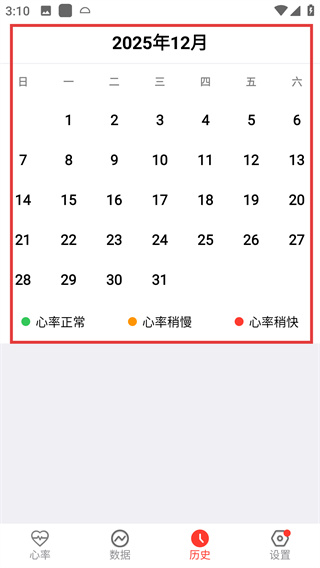 3、在【歷史】頁(yè)面可查看2025年12月每日心率狀態(tài),通過(guò)顏色標(biāo)識(shí)區(qū)分正常、稍慢、稍快的情況。