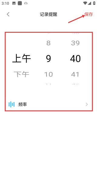 4、在【記錄提醒】設(shè)置頁(yè)調(diào)整時(shí)間和頻率后,點(diǎn)擊右上角【保存】按鈕,完成提醒設(shè)置。