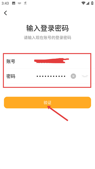 4、在輸入登錄密碼頁填寫賬號與密碼后,點擊【驗證】按鈕,完成身份驗證以推進賬號注銷流程。