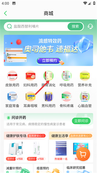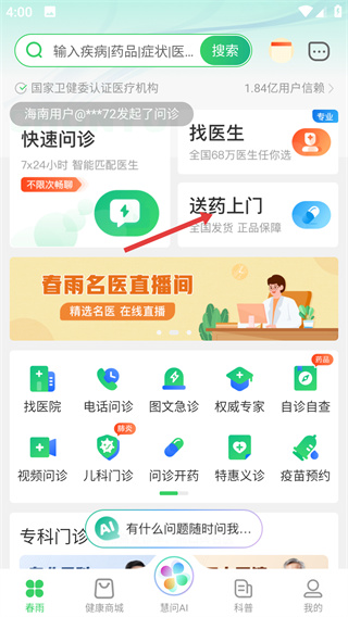 1、在春雨醫(yī)生首頁點擊【送藥上門】選項,進入健康商城頁面,該頁包含藥品分類、問診開藥方等功能模塊。