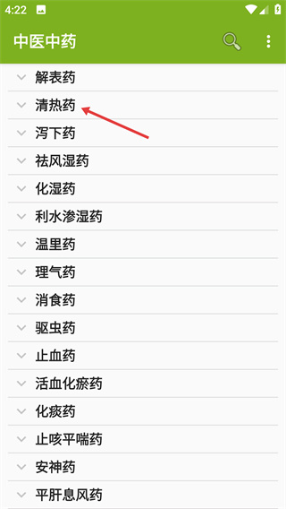 1、在中醫(yī)中藥分類(lèi)頁(yè)面,點(diǎn)擊【清熱藥】選項(xiàng),展開(kāi)該類(lèi)別對(duì)應(yīng)的子分類(lèi)列表。