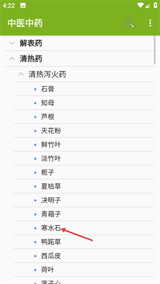 2、在清熱藥的子分類(lèi)列表中,點(diǎn)擊【清熱瀉火藥】選項(xiàng),展開(kāi)該類(lèi)別下的具體中藥條目列表。