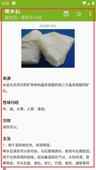 3、在清熱瀉火藥的中藥列表中,選擇【寒水石】條目,進(jìn)入該中藥的詳情介紹頁(yè)面。