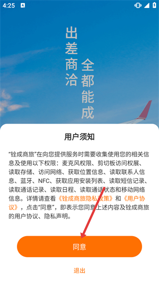 1、閱讀“銓成商旅”的用戶須知及關(guān)聯(lián)協(xié)議后,點擊【同意】按鈕,進入登錄方式選擇界面。