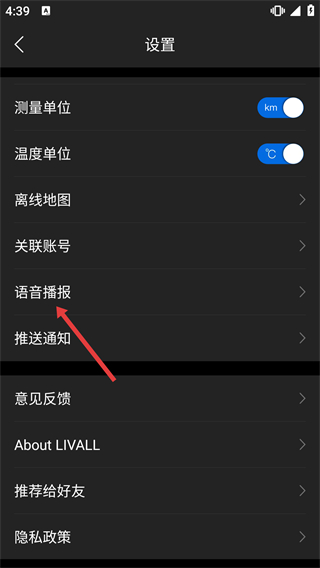 2、在設(shè)置界面點擊【語音播報】選項,進入語音播報的配置頁面,可管理播報相關(guān)的功能開關(guān)。