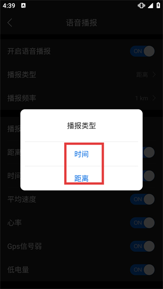 4、在播報類型彈窗中,選擇“時間”或“距離”作為播報類型,完成語音播報維度的設(shè)置。
