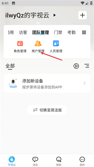 1、在宇視云的團隊管理頁面,點擊【用戶管理】選項,進入用戶管理頁面,可查看當前已添加的用戶列表。