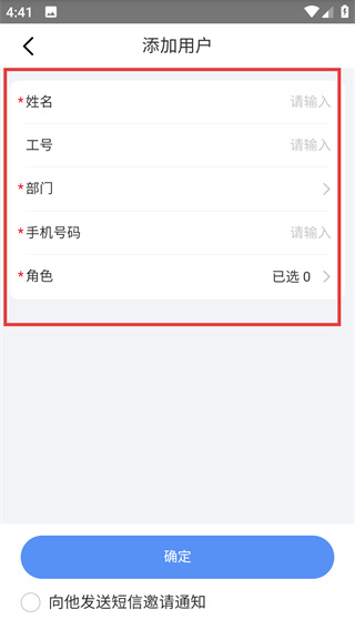3、在添加用戶表單頁,填寫姓名、部門、手機號碼、角色等必填信息,完善新用戶的基礎(chǔ)資料。