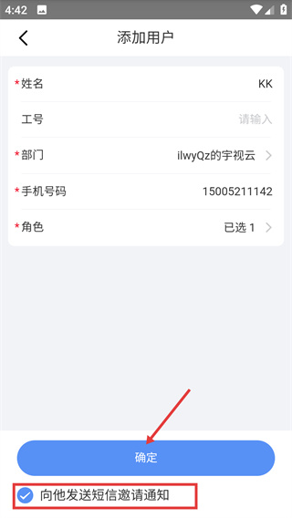 4、勾選“向他發(fā)送短信邀請通知”選項后,點擊【確定】按鈕,完成新用戶的添加及邀請操作。