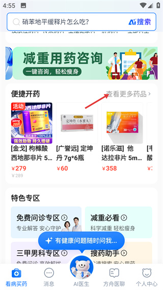 1、在“看病買藥”頁面點(diǎn)擊【查看更多藥品】選項(xiàng),進(jìn)入涵蓋多品類藥品的綜合列表展示頁面。