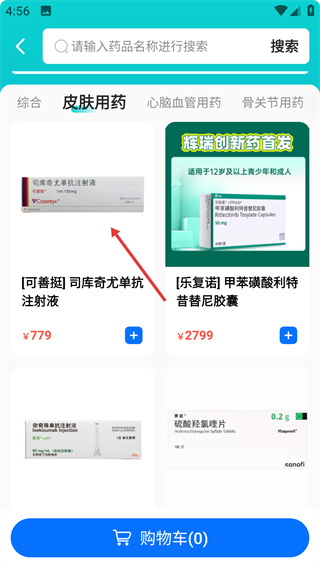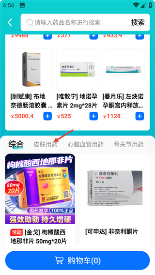 2、在藥品列表頁點(diǎn)擊【皮膚用藥】分類標(biāo)簽,進(jìn)入皮膚用藥類別的專屬藥品列表頁面。