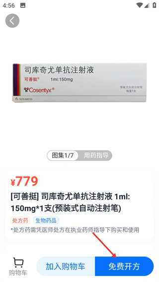 4、在藥品詳情頁點(diǎn)擊【免費(fèi)開方】按鈕,推進(jìn)該處方藥的處方申請(qǐng)流程,處方藥需憑醫(yī)師處方購買及使用。