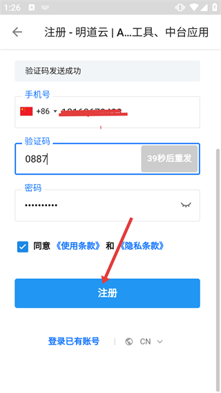 2、在注冊(cè)頁(yè)面填寫【手機(jī)號(hào)】-【驗(yàn)證碼】-【密碼】,勾選協(xié)議后點(diǎn)擊【注冊(cè)】按鈕,完成賬號(hào)注冊(cè)步驟。