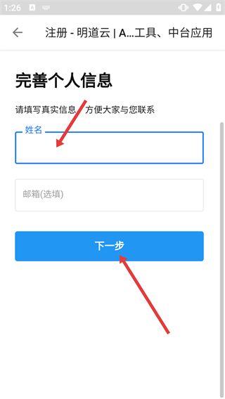 3、進(jìn)入完善個(gè)人信息頁(yè)面,填寫【姓名】(郵箱選填)后,點(diǎn)擊【下一步】按鈕推進(jìn)注冊(cè)流程。