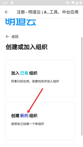4、進(jìn)入創(chuàng)建或加入組織頁(yè)面,選擇【創(chuàng)建新的組織】選項(xiàng),可開啟【明道云】組織的創(chuàng)建操作。