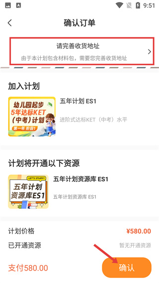 4、在確認(rèn)訂單頁(yè),先完善收貨地址,之后點(diǎn)擊【確認(rèn)】按鈕,完成該學(xué)習(xí)計(jì)劃的加入流程。
