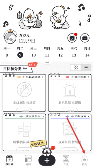 1、在計(jì)劃類APP的“做計(jì)劃”主界面,點(diǎn)擊底部導(dǎo)航欄的【我的】選項(xiàng),進(jìn)入個(gè)人中心頁面。